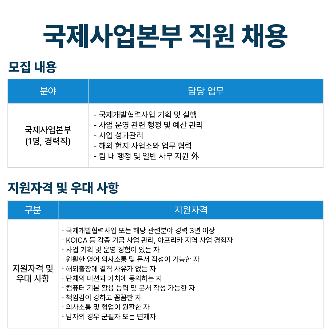 지구촌나눔운동 국제사업본부 직원 채용 공고 (~9/13(토) 24시까지)